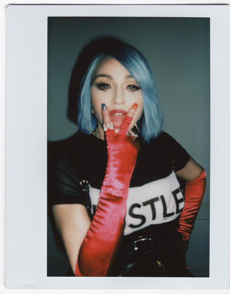 OTTENBERG: The Hustler t-shirt she's wearing is genius because this motherfucker is still hustling the hardest. And she still has the best boobs in the world. I can't even believe I'm looking at these unretouched Polaroids and these boobs are still so beyond. As a fan that is very up on every Madonna look that she has ever worn, I'm feeling some self-referential moments in these looks. I'm feeling things like Susan in Penn Station bathroom mixed with the "Hollywood" video and V/Steven Klein/Katy Perry.