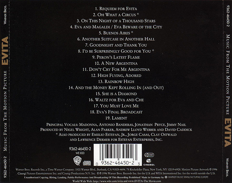 Nigel Wright, Alan Parker, Andrew Lloyd Webber and David Caddick produced the official soundtrack for Evita. There were two versions: there was the 'highlights' album called "Music from the Motion Picture Evita", containing 19 tracks (see above), which was released in October 1996 in Europe and Asia and in August 1997 in the US.