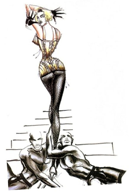 French designer Jean-Paul Gaultier created the costumes for the Blond Ambition Tour, including the famous golden corset. Below are the sketches he made of the different tour outfits.