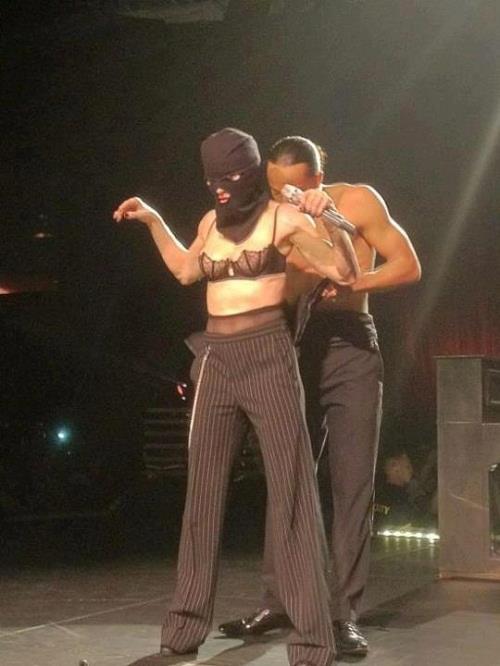 Fortunately, nothing serious happened during the MDNA show. Even though Madonna made another statement about the case: when revealing her back at the end of Human Nature, the usual 'No Fear' was replaced by 'Pussy Riot'. She also wore the trademark balaclava worn by punk band Pussy Riot.